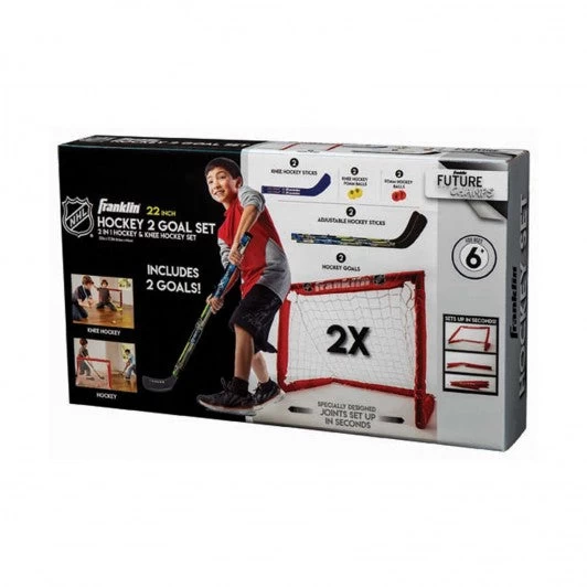 What better way to learn hockey than with this 2-in-1 set that can be used for both indoor knee hockey and street hockey? This set features two INSTA-SET® hockey goals, two mini hockey sticks and two adjustable hockey sticks. The set also features a small foam hockey ball and an official size street hockey ball.