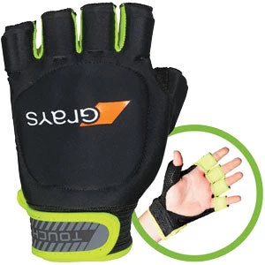 Open-palm glove with adjustable wrist closure. Molded knuckle protection with internal foam padding